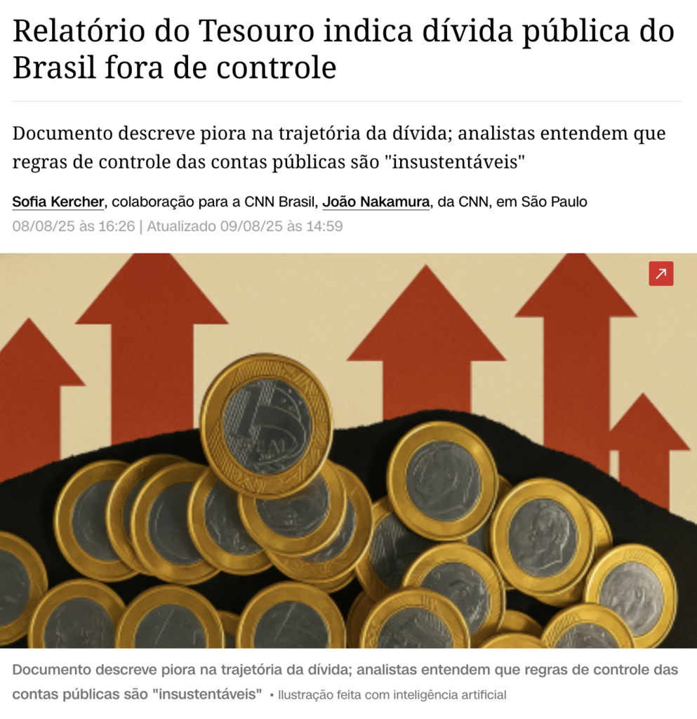 - Dívida pública de R$ 8,8 trilhões — equivalente a 80% do PIB nacional.